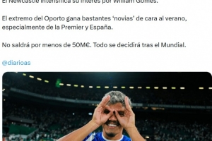 记者:纽卡有意波尔图边锋威廉·戈麦斯,转会费预计超5000万欧