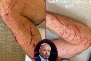 希勒写道:“自行车道上的坑洼真糟糕。”图中希勒的手臂和腿部有多处割伤和擦伤。