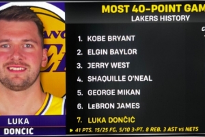 据统计,这是东契奇湖人生涯第17次单场40+,湖人队史第七多,差一场追平詹姆斯,详情如下: