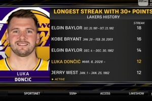 能延续吗?东契奇已连续12场30+ 今天可能超越韦斯特独居队史第四